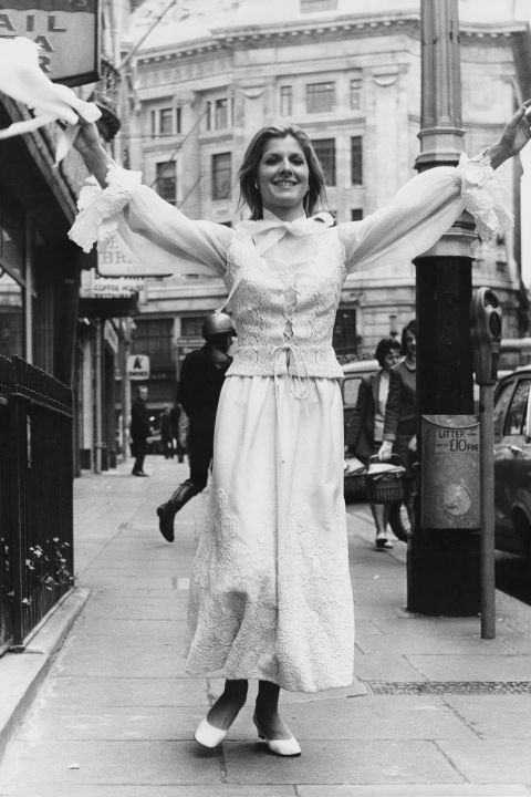 | A woman shows off her Christian Dior wedding gown on the street in London, 1970 |
