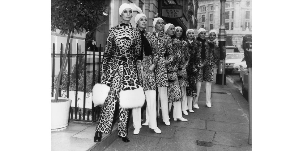 | Leopard fur coats being modeled on the street in London, 1972